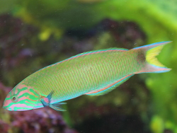 ein sehr schöner Lippfisch der in seiner Jugend eher unscheinbar ist. voll ausgefärbte Männchen sind prächtig gefärbt. wenn Sie gut gefüttert werden und sich wohl fühlen haben die Männchen einen kräftig gelben Fleck im Nacken. in der Natur sind immer viele Tiere unterschiedlichster Größe zusammen. deshalb ist sicher auch eine Haltung mit mehreren Tieren möglich. ich selbst kann das nur von zwei Tieren bestätigen. Futter wird jedes gern angenommen. sonst ist er im Verhalten wie alle anderen Halichoeres. leider viel zu selten im Handel. Gruß Frank
