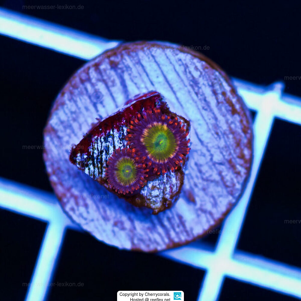 These beautiful Zoanthid or button polyps are sold as Zoanthus "CC Sublime " at Local fish Dealers and in online coral Shops. Many Thank to Cherrycorals for the wonderful Picture.