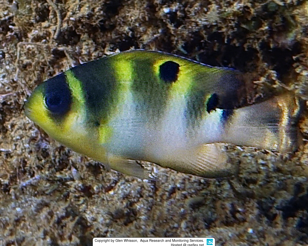 Der Barsch hat einen weißen Körper mit 5 schwarzen Balken, er ist gelb auf dem Rücken und besitzt zwei deutlich sichtbare Augenflecken, einen in der Mitte des Rückens unterhalb der Rückenflosse, ein großer Teil dieses Flecks zieht sich in das dritte dunkle Band hinein, und der zweite befindet sich auf der Schwanzbasis an der hinteren Basis der Rückenflosse.