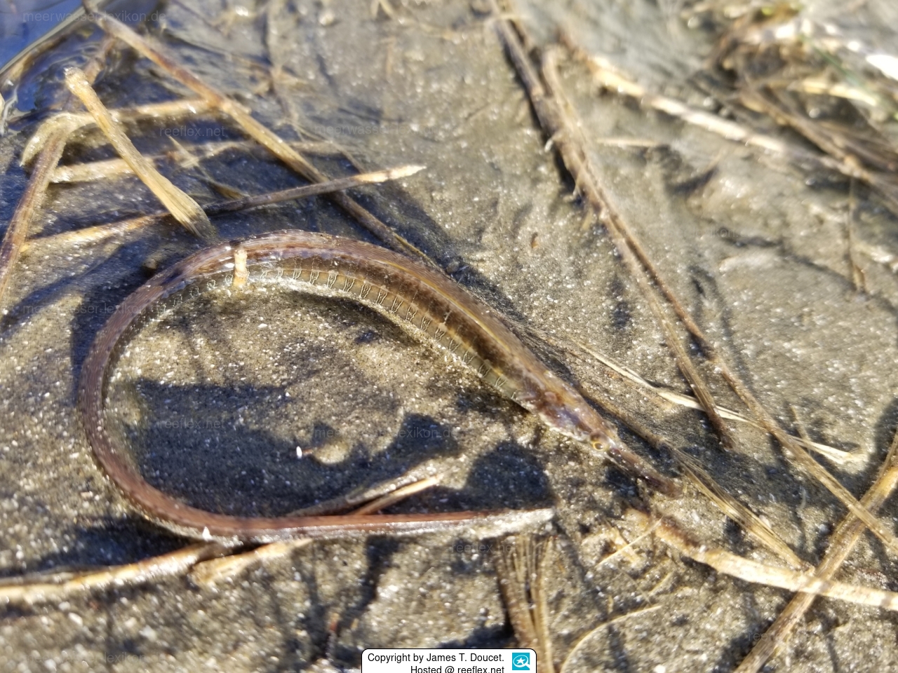 The gulf pipefish is most similar to the chain pipefish. It differs from it in having 16-17 (as opposed to 19-20) proboscis rings, 31 (as opposed to 35-36) tail rings and a shorter snout. Pipefishes differ from all other freshwater fishes by the absence of pelvic fins and by the fact that their bodies are encased in bony rings (Ross 2001).