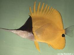 The Very-long-nose Butterflyfish is bright yellow; the upper half of head and nape is almost black, lower part of head and snout is silvery white, has a series of rows of blackish dots on chest; a black spot on anal fin just below base of caudal fin.