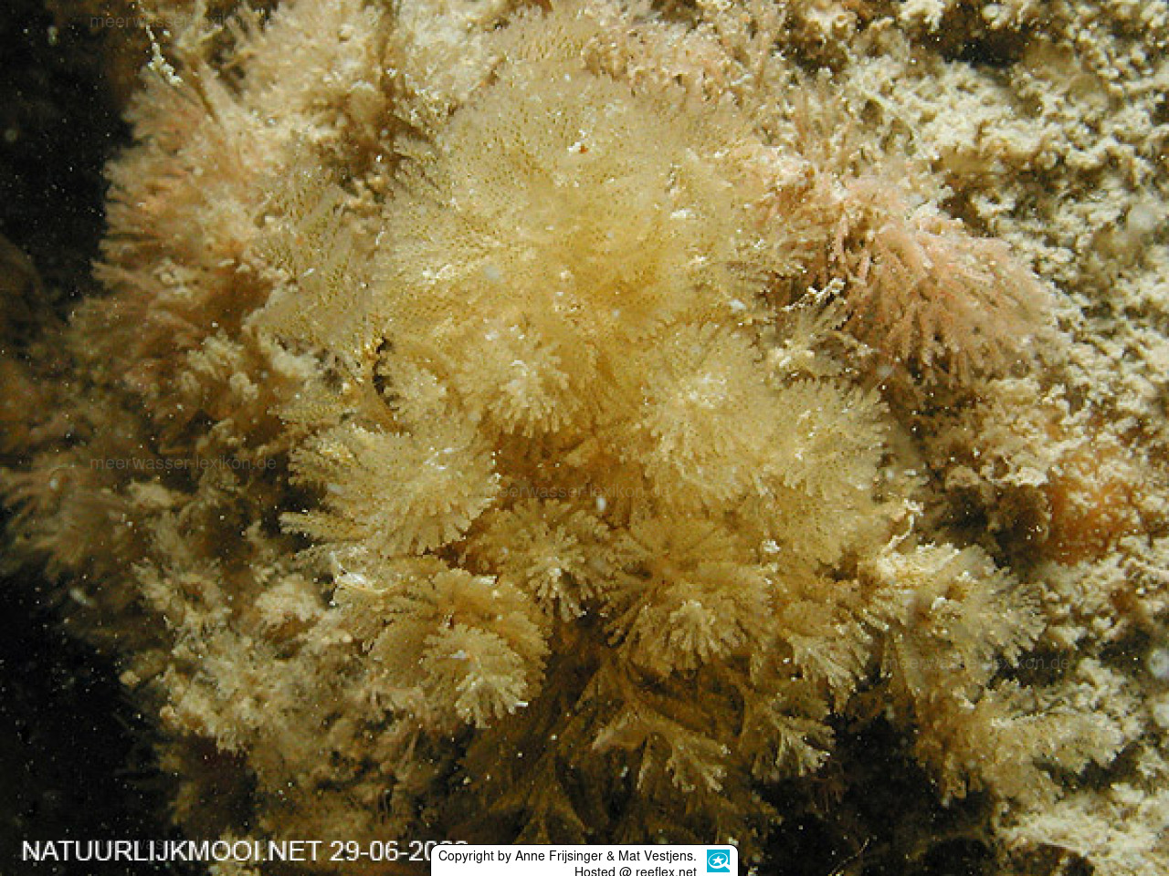 Bugulina turbinata colonies are composed of dichotomous branches arranged spirally around the main axis to form bushy tufts. The species is orange-brown in colour and 3 – 6 cm high.