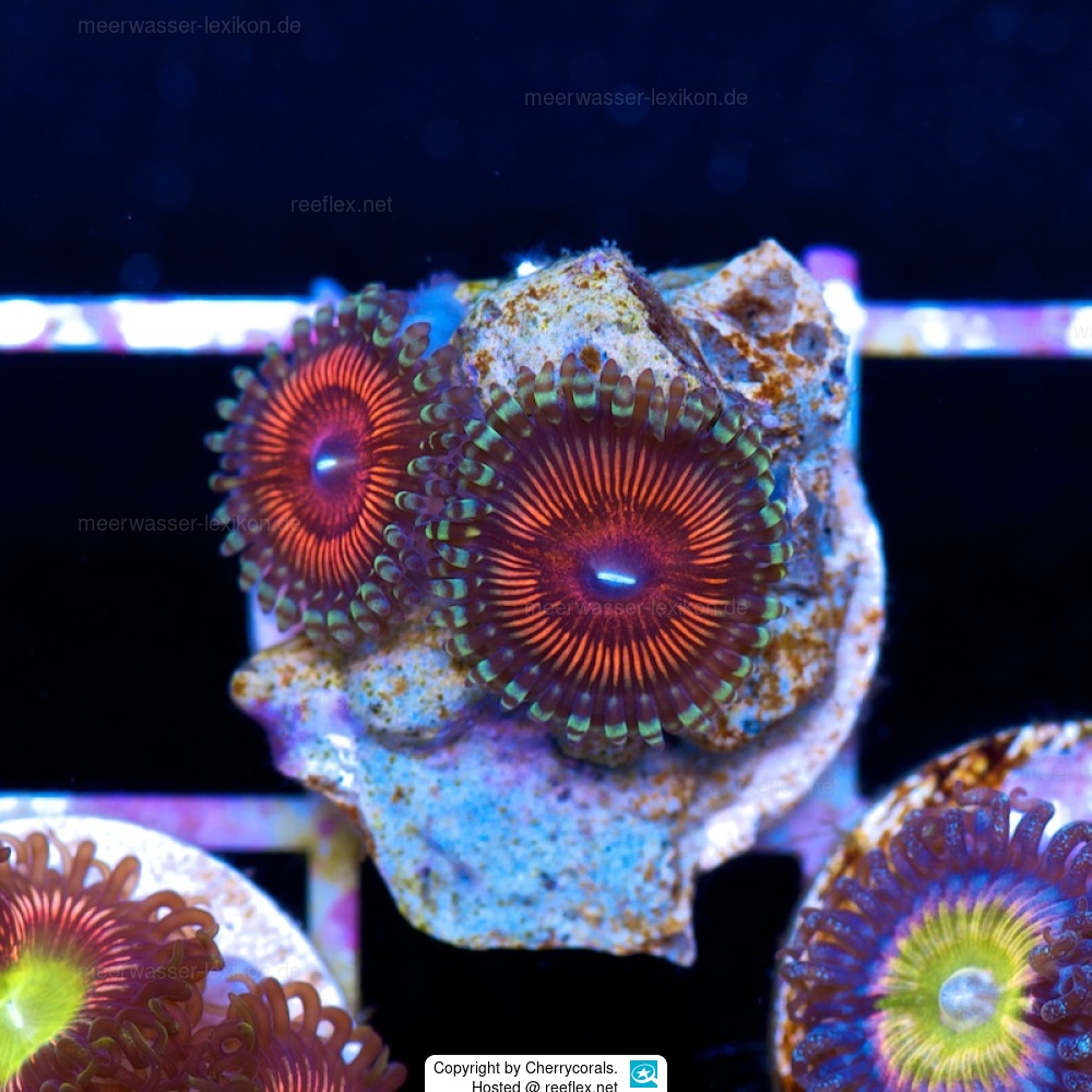 Apart from their colour and polyp size most Zoanthus species look very much alike, so they can hardly be identified exactly by mere physical appearance. Marine aquarists and coral traders have assigned telling names to the large variety of Zoanthus species referring to the special colouration morphology of the polyps to identify a particular specimen. Firstly, these fancy variety names are commonly used in the stocking lists of importers and coral shops, secondly, the majority of saltwater hobbyists are more familiar with them and thirdly, the reeflex entries will be easier to find via search engines. So that is why we have decided to list the different varieties of Zoanthid species under their common fancy names on reeflex.